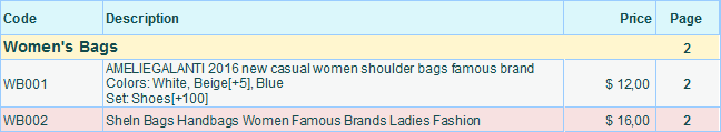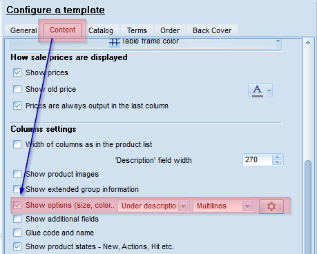 Open the "Contents" tab. Price lists and contents of full catalogs are configured in a similar way. Check the "Show Options" box. According to your requirements to a convenient, informative and compact price list template or any other personal wishes, you can display options in a separate column under product names. You can display options in one line with automatic hyphenation or start a new line for each option.