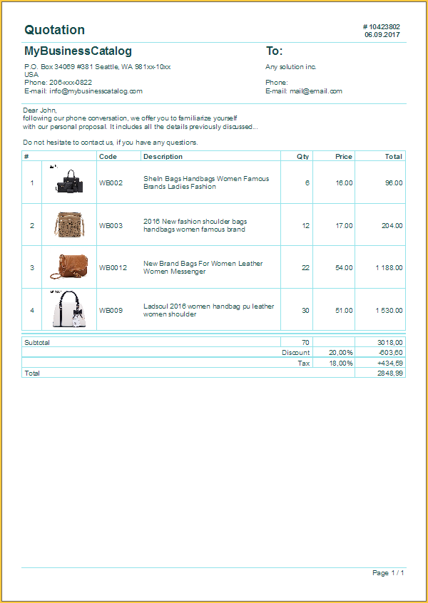 01 A4 QUOTE w images fields v6Comprehensive business proposal template with maximum product information and additional fields.